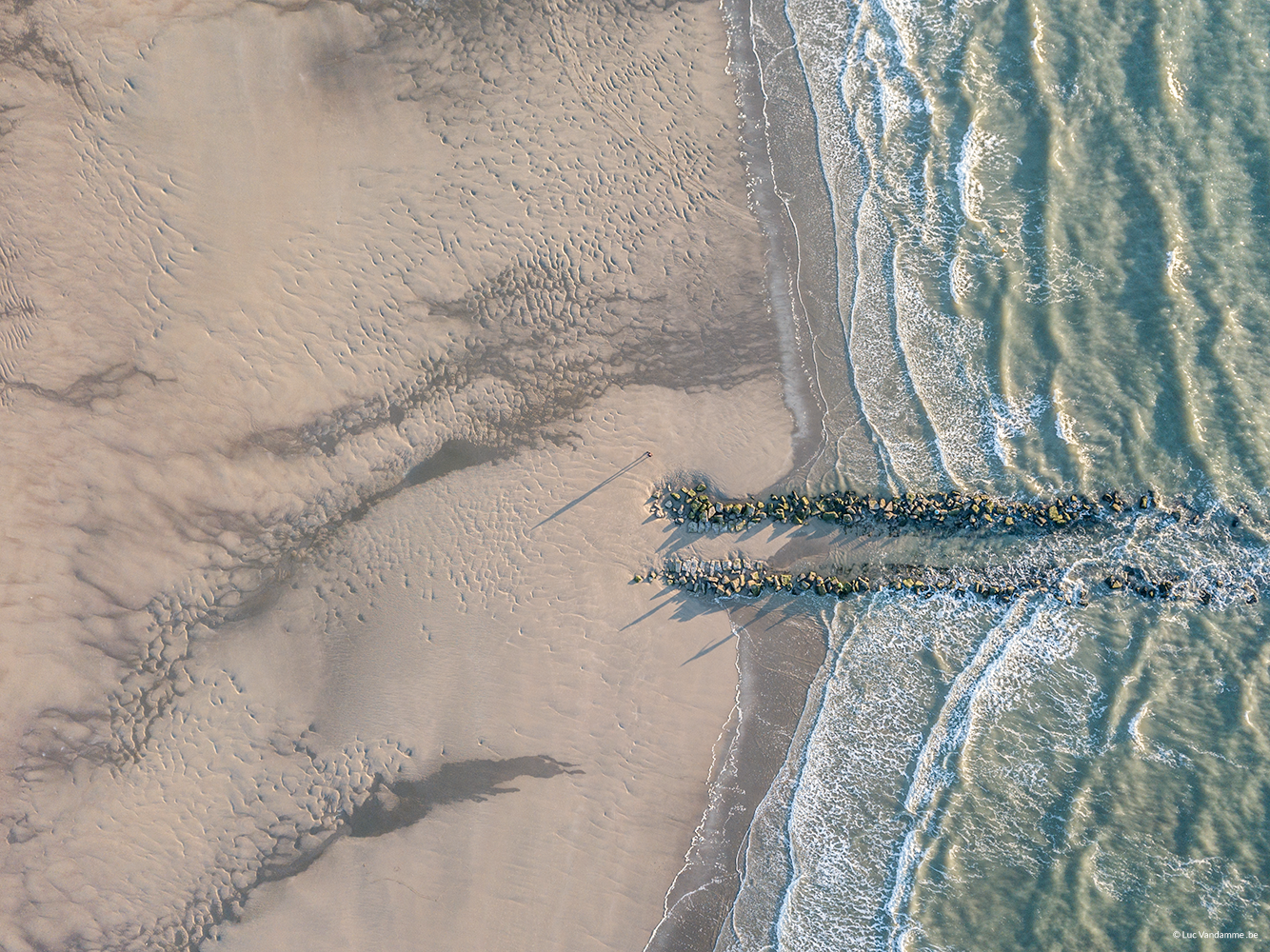 Discover the raw beauty of the coastline with this fascinating top-down perspective. The graphic line of the stone groyne provides a powerful anchor as it slowly vanishes into the dynamics of a turbulent, foaming sea. This abstract natural portrait captures the eternal struggle between land and water in a minimalist composition. A modern and intriguing artwork that brings texture, depth, and a sense of untamed energy to your interior.