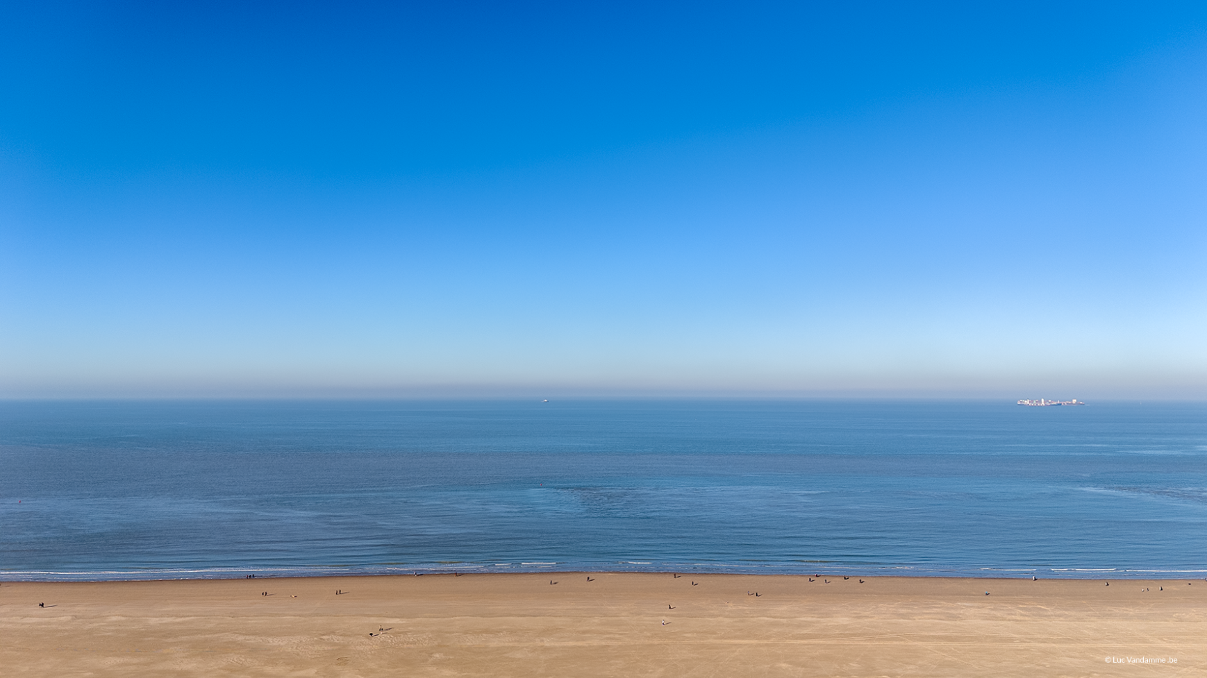Experience ultimate freedom with this expansive aerial panorama. The composition is dominated by an impressive, deep blue sky that blends seamlessly into the calm North Sea. At the bottom, the vast, golden beach provides a peaceful foundation, where tiny figures emphasize the human scale and the enormous vastness of the coastline. A minimalist and soothing masterpiece that brings a sense of boundless space and serenity straight into your interior.