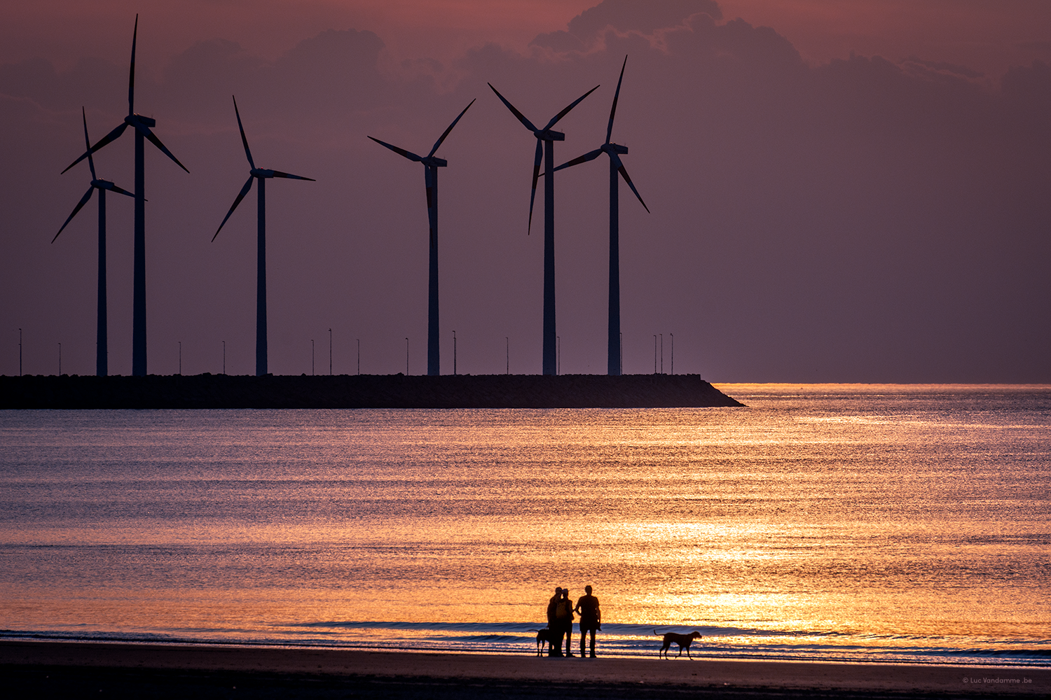 Capture the magic of a golden moment on the horizon. This striking image combines human connection with the power of modern energy and the timeless beauty of the sea. The warm, copper shimmer on the water and the bold silhouettes of the wind turbines create an atmosphere of peace, progress, and togetherness. A unique piece of art that adds warmth and a profound story to any modern living space.
