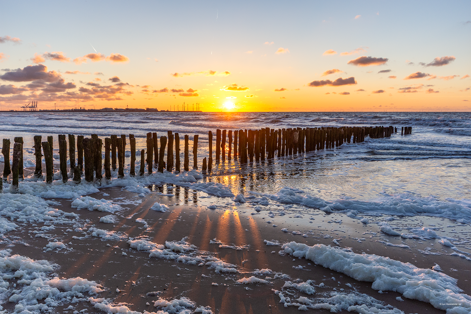 Bring the raw beauty of the North Sea into your home with this commanding scene. The rhythmic line of weathered wooden groynes defies the turbulent sea as the water surges around them at mid-tide. In the background, the sun rests perfectly on the horizon, creating a spectacular contrast with the distant silhouette of the Zeebrugge harbor dam. An image full of movement, drama, and coastal character that infuses any space with a bold and timeless energy.
