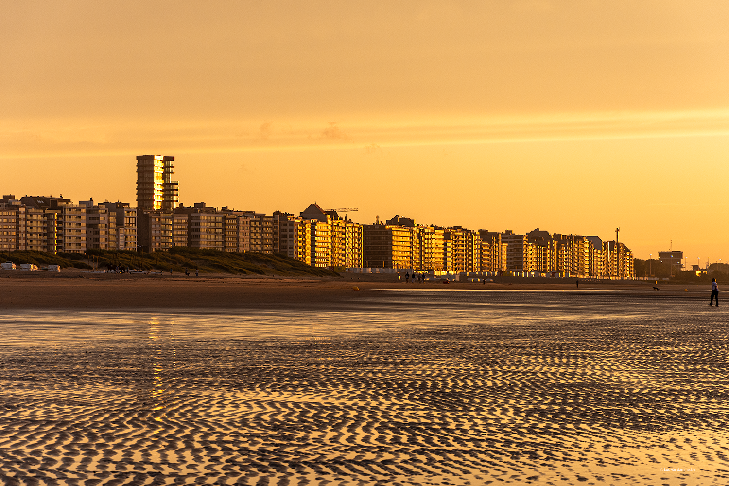Experience the transformation of Heist with this impressive evening portrait. The sky turns a fiery orange at sunset, casting the new skyline and the iconic Heldentoren in a powerful silhouette against the horizon. In the foreground, the warm light reflects on the wet beach, where the delicate ripples in the sand create a beautiful graphic pattern. This artwork captures the perfect harmony between modern architecture and the timeless elements of nature, bringing a warm, luxurious ambiance to any interior.