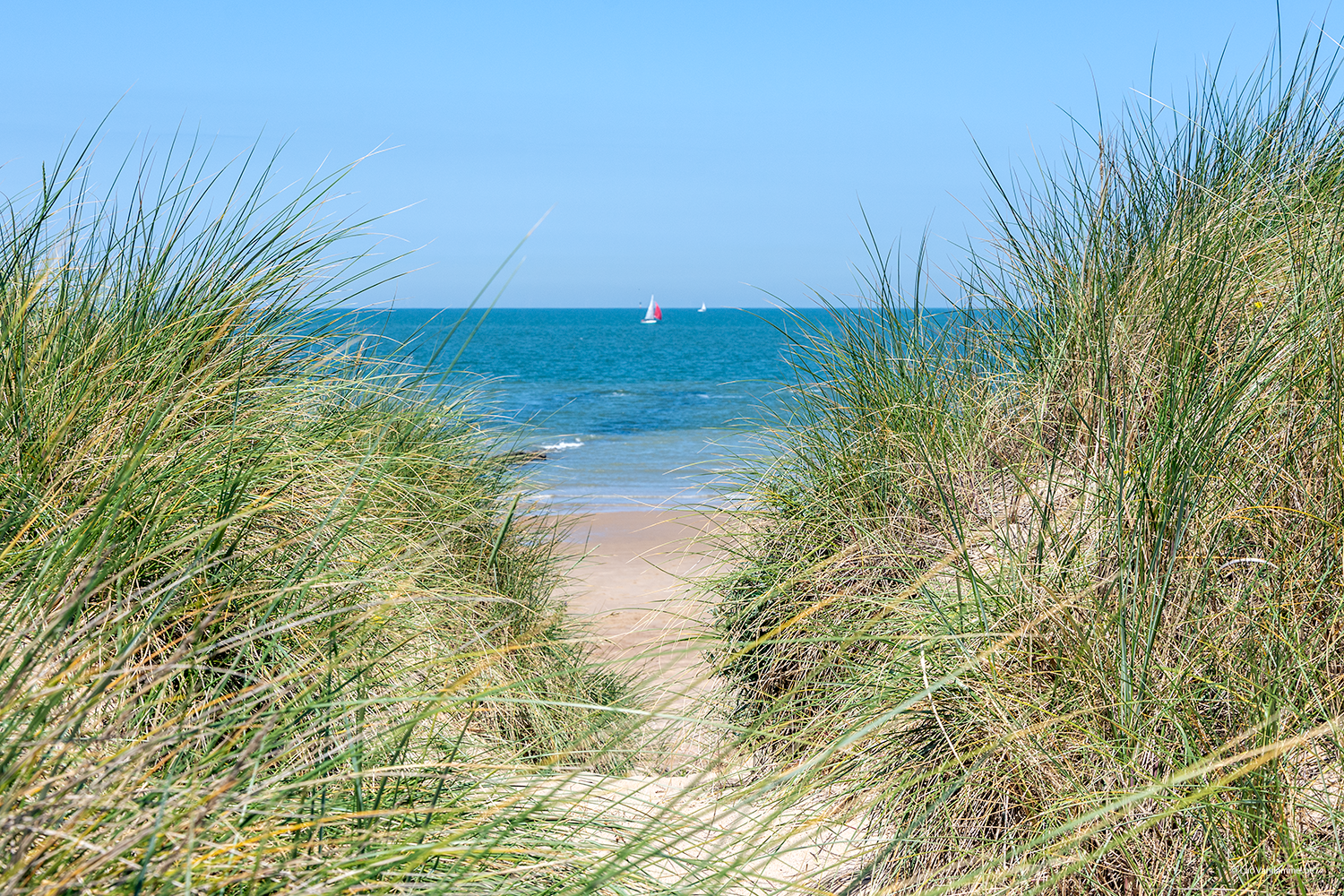 Vivez une sensation ultime de découverte avec cette vue idyllique entre deux dunes. Niché au cœur d'un relief vallonné, orné d'oyats verdoyants, un panorama grandiose s'ouvre sur l'eau scintillante. Un voilier solitaire à l'horizon souligne le calme et la liberté de cette journée d'été ensoleillée. Cette œuvre apporte la fraîcheur de l'air marin et un sentiment de vacances intemporel directement dans votre intérieur, offrant une évasion sereine loin du quotidien.