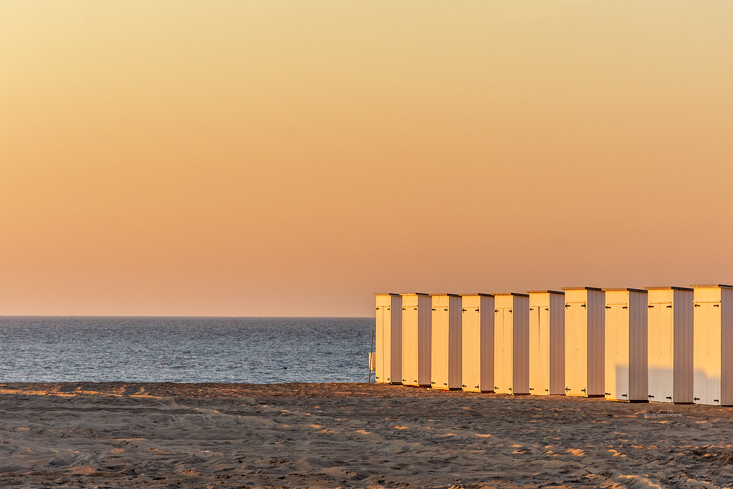 Retrouvez la nostalgie pure de la côte belge avec cette composition sereine. L'alignement rythmé des cabines de plage blanches baigne dans la lumière douce et chaude d'un soleil couchant, évoquant un sentiment d'ordre et de paix intemporelle. Cette image est une ode à la simplicité estivale ; une œuvre minimaliste et apaisante qui équilibre parfaitement l'immensité de la mer et le réconfort de la plage.
