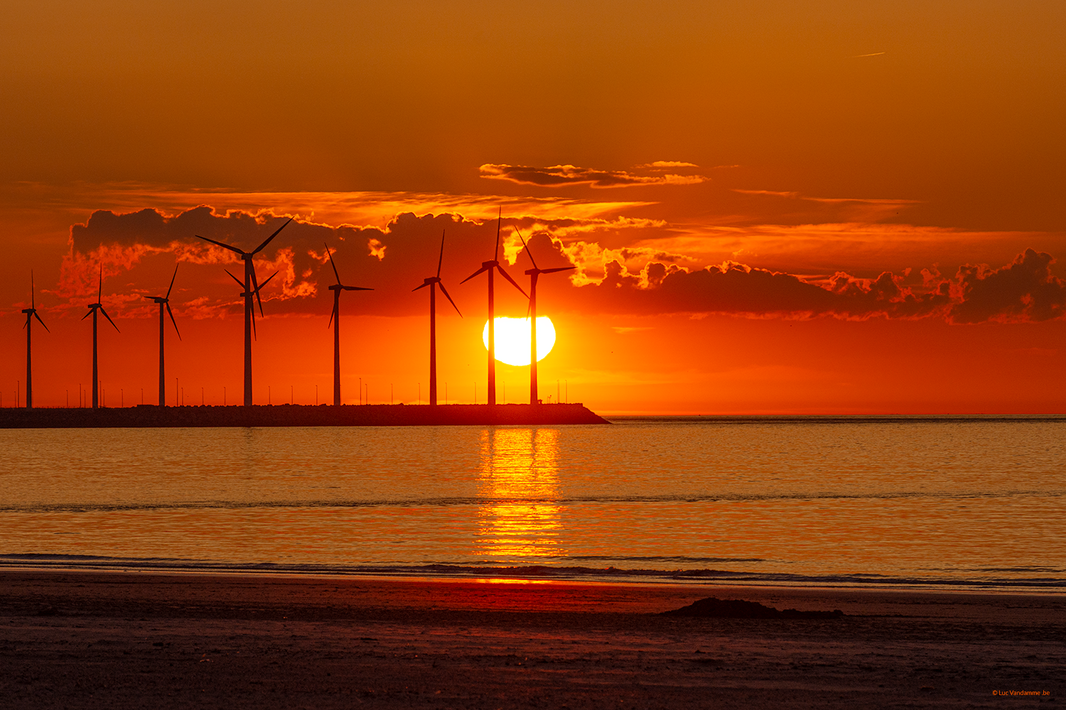 Ce panorama puissant capture la rencontre magique entre la technologie humaine et les éléments naturels. Le soleil couchant forme un disque orange ardent qui dessine les contours du port et des éoliennes en une silhouette dramatique. Le reflet de la lumière sur l'eau calme et la plage humide crée une lueur chaleureuse, presque mystique. Une œuvre impressionnante et atmosphérique qui immortalise de manière unique le dynamisme du littoral.