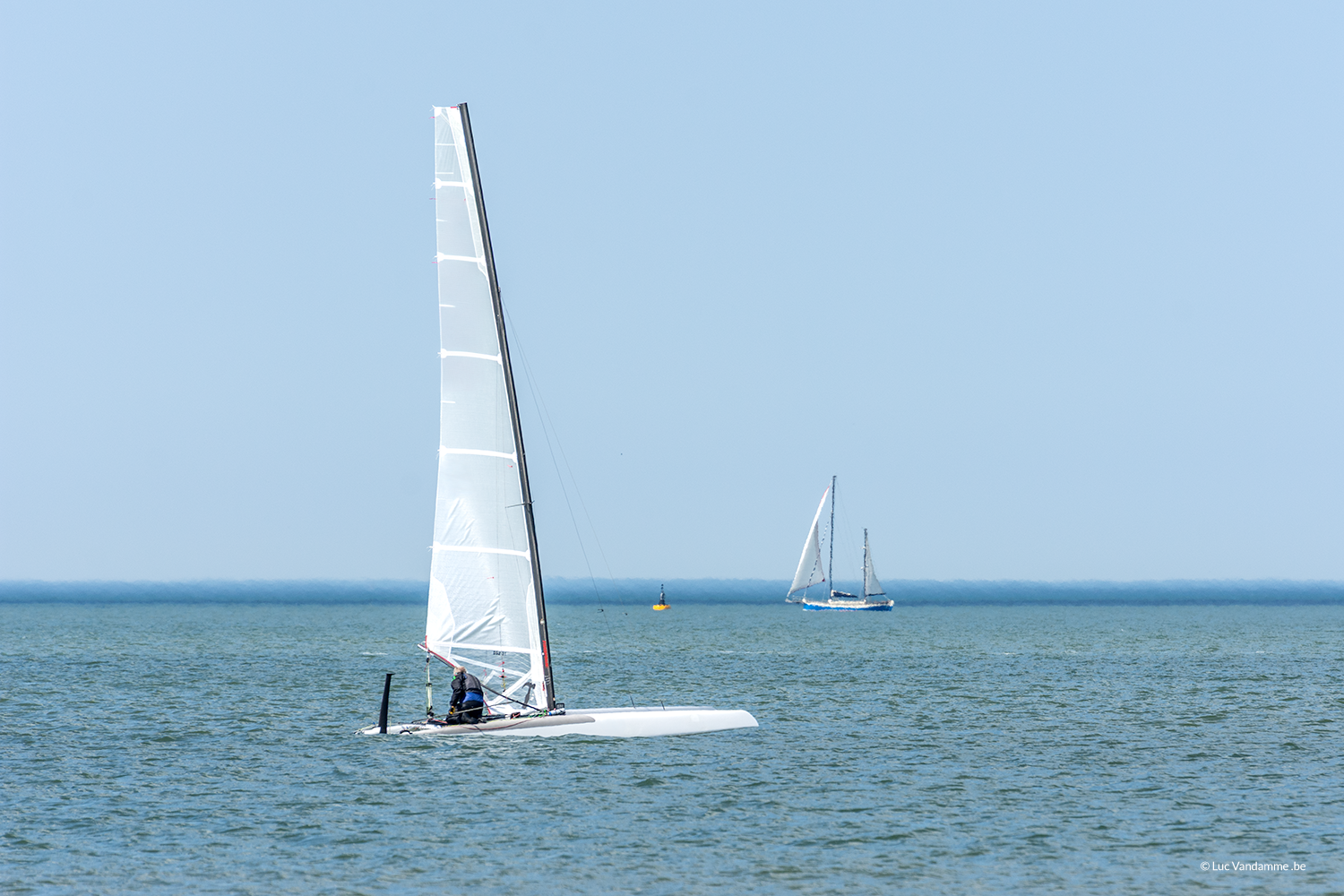 Ervaar de pure elegantie van het zeilen met dit serene beeld. Een slanke, witte catamaran glijdt moeiteloos over de zacht kabbelende Noordzee, terwijl het opvallend hoge zeil bijna lijkt op te gaan in de lichte zomerlucht. In de verte voegt een klassiek zeiljacht een extra laag van tijdloze maritieme schoonheid toe aan de horizon. Dit beeld vangt de stilte en de technische perfectie van de watersport, en brengt een gevoel van rust en moderne klasse naar je muur.