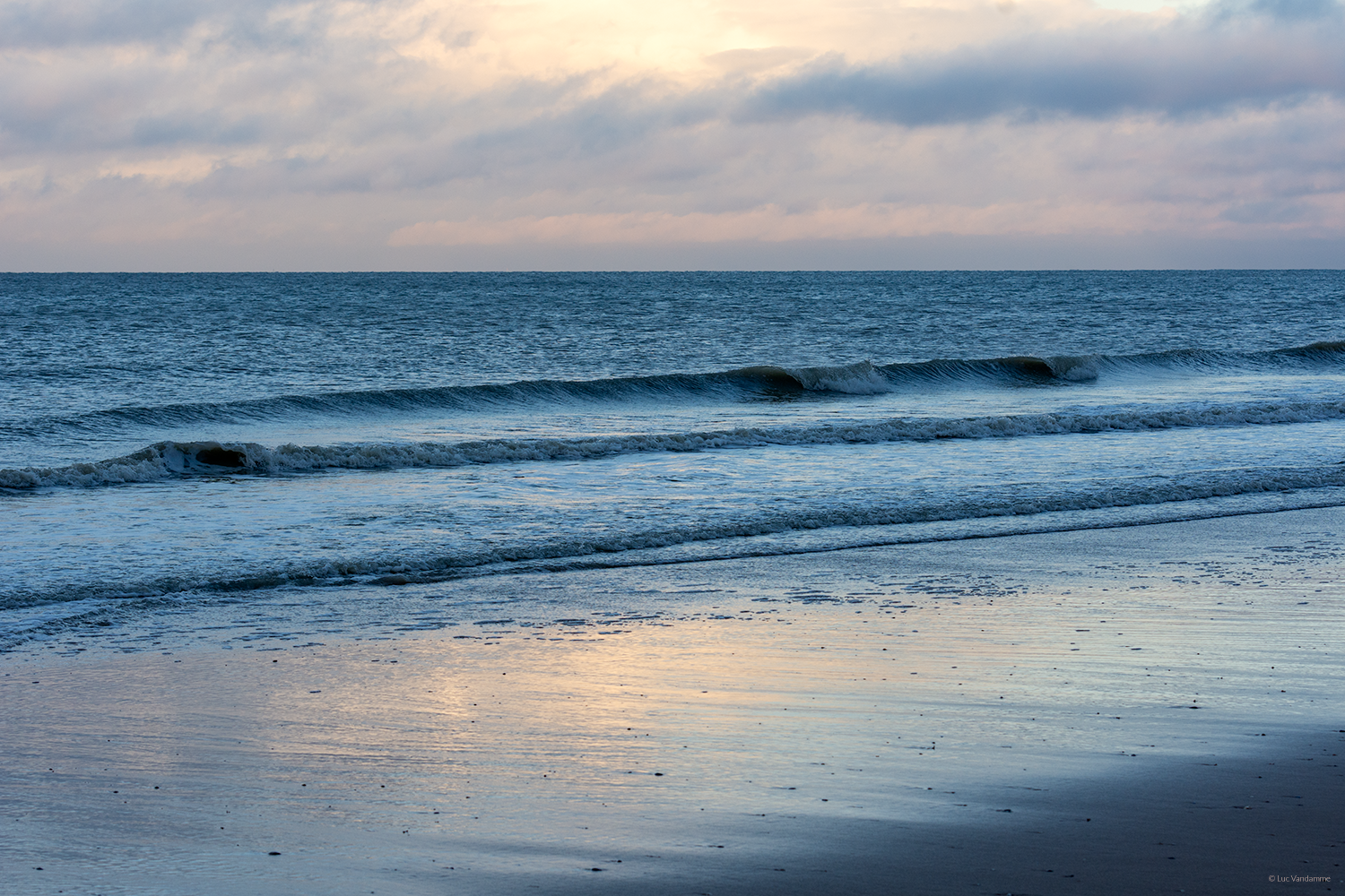 Ervaar de serene overgang van dag naar nacht met dit sfeervolle beeld van het blauwe uur. De koele, diepe tinten van de lucht en de subtiele reflecties op het natte strand creëren een sfeer van absolute rust en introspectie. Dit kunstwerk brengt een moderne, rustgevende elegantie in je interieur, perfect voor wie op zoek is naar een tijdloos beeld dat de mystiek van de late kustlijn vangt.