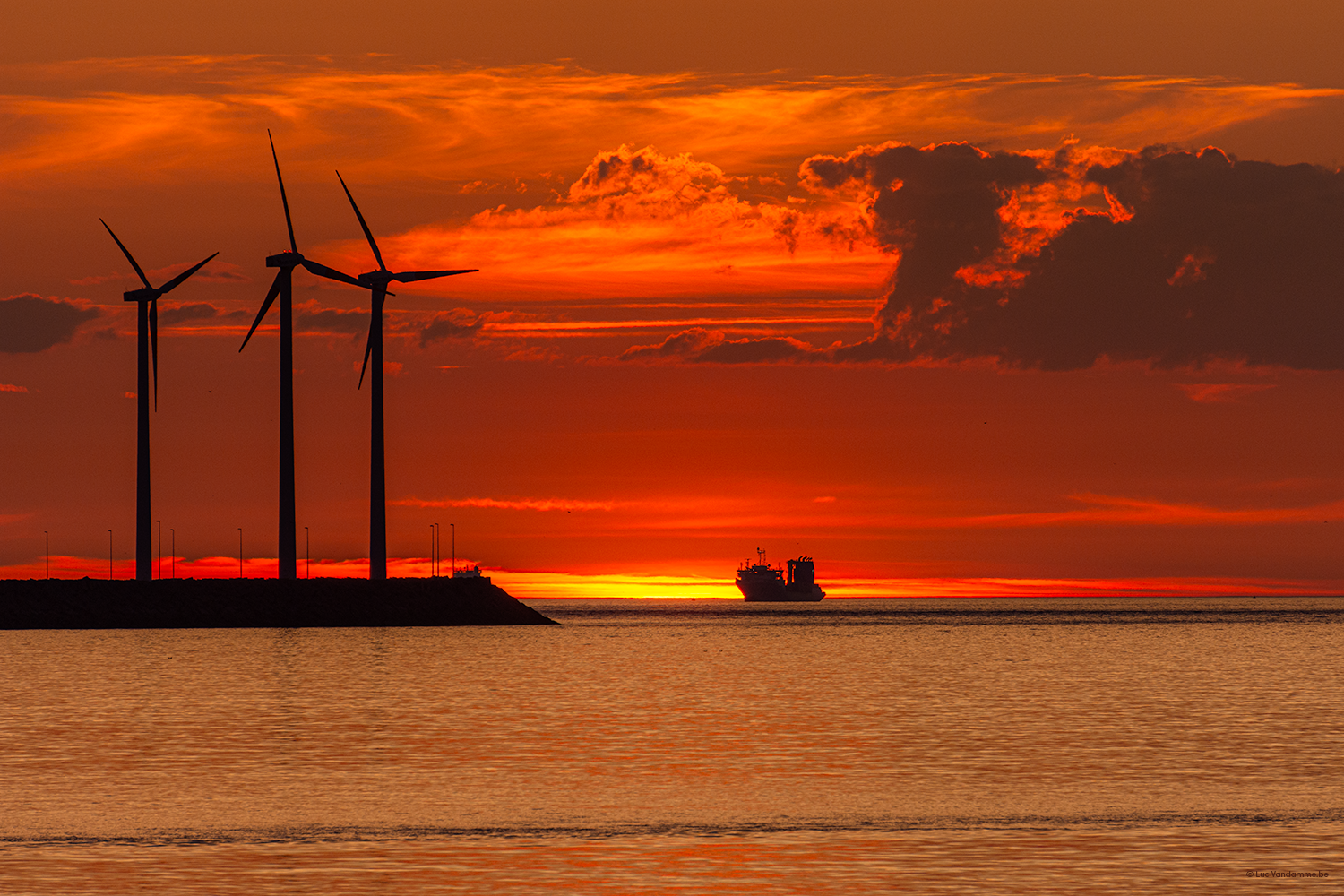 Geef je interieur een krachtige energie met een explosie van kleur en licht. De dieprode lucht en de goudgele horizon vormen een indrukwekkend decor voor de verre contouren van de windmolens en een schip op de horizon. Dit beeld vangt het moment waarop de dag zijn maximale intensiteit bereikt, een meeslepend kunstwerk dat warmte en een onvergetelijke indruk in elke kamer brengt.