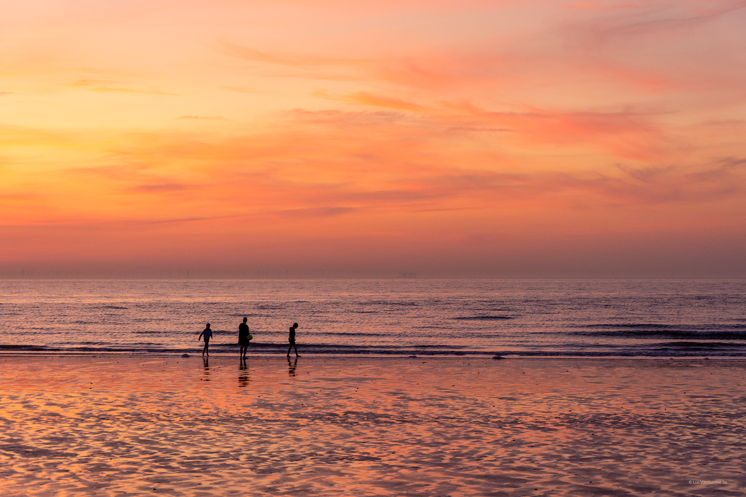 Laat je meevoeren door de intense gloed van een zonsondergang die de horizon in vuur en vlam zet. Het frontale zeezicht en het natte strand creëren een perfecte spiegel voor het overvloedige oranje licht, terwijl de sluierwolken een zachte, dromerige textuur aan de lucht geven. De drie figuren aan de waterlijn voegen een prachtig menselijk element toe aan dit grootse natuurdecor—een kunstwerk dat warmte, verbondenheid en de energie van een zomeravond in je huis brengt.