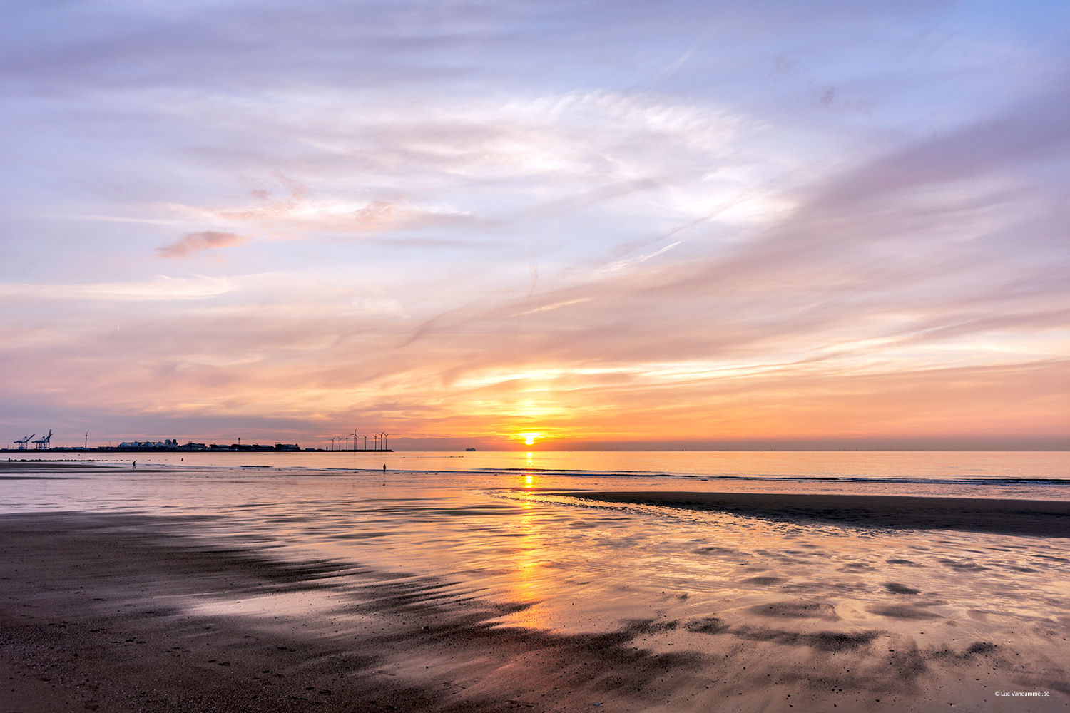 Beleef de weidsheid van de zee op haar mooist met dit panoramische meesterwerk. De lucht is een schildersdoek van zachte pastelkleuren en dramatische sluierwolken, terwijl de ondergaande zon een schitterend lichtspoor trekt op het natte strand. De verre contouren van de haven en de windmolens voegen een modern-industrieel accent toe aan dit dromerige natuurlandschap. Een beeld vol diepte en reflectie dat een gevoel van grenzeloze vrijheid en verstilling in je interieur brengt.